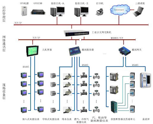 站控管理层针对能耗监测系统的管理人员,是人机交互的直接窗口,也是系统的最上层部分。主要由系统软件和必要的硬件设备,如工业级计算机、打印机、UPS 电源等组成。监测系统软件具有良好的人机交互界面,对采集的现场各类数据信息计算、分析与处理,并以图形、数显、声音等方式反映现场的运行状况。